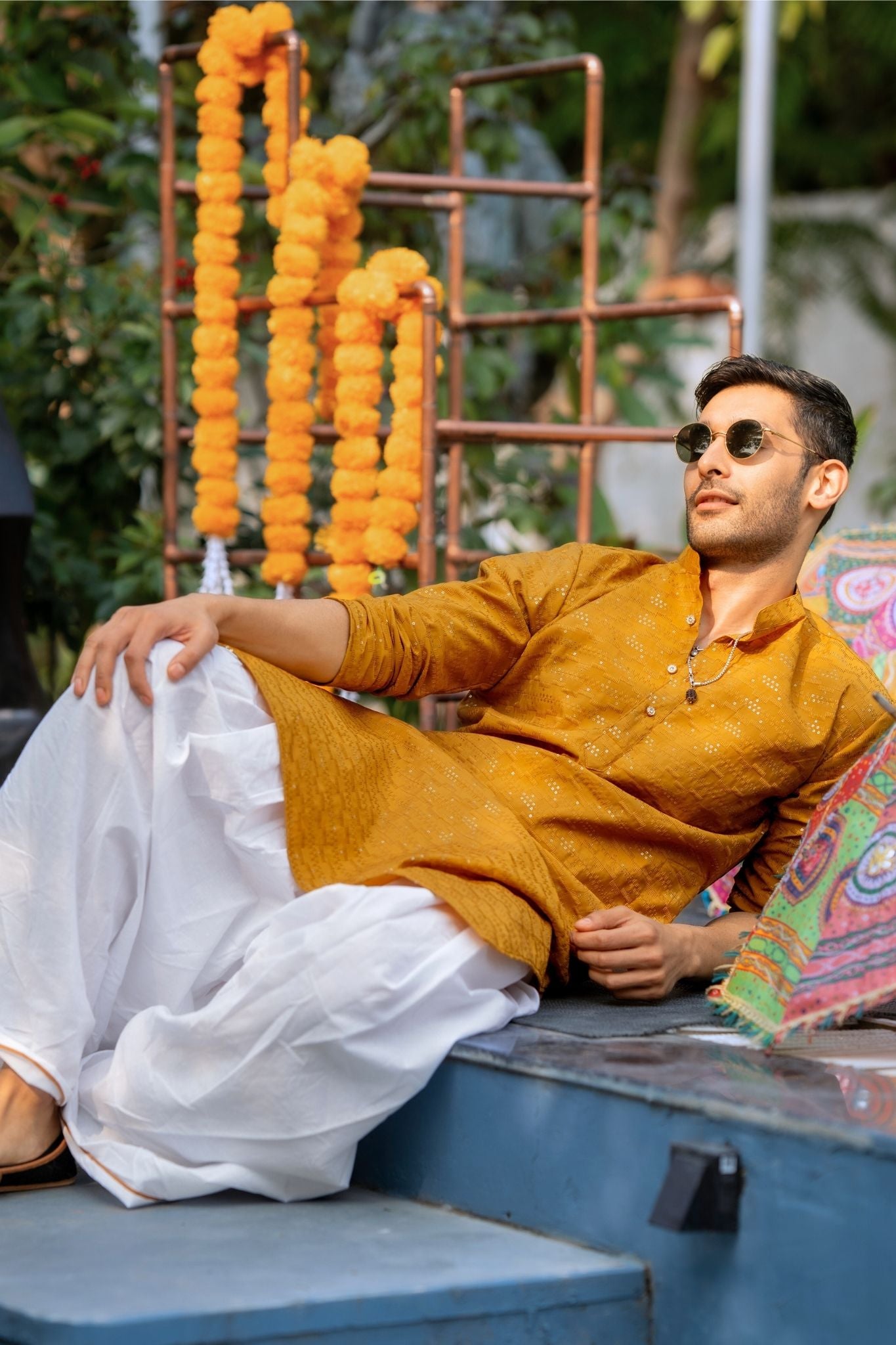 Amber Yellow Long Kurta with All-Over Floral Foil Print